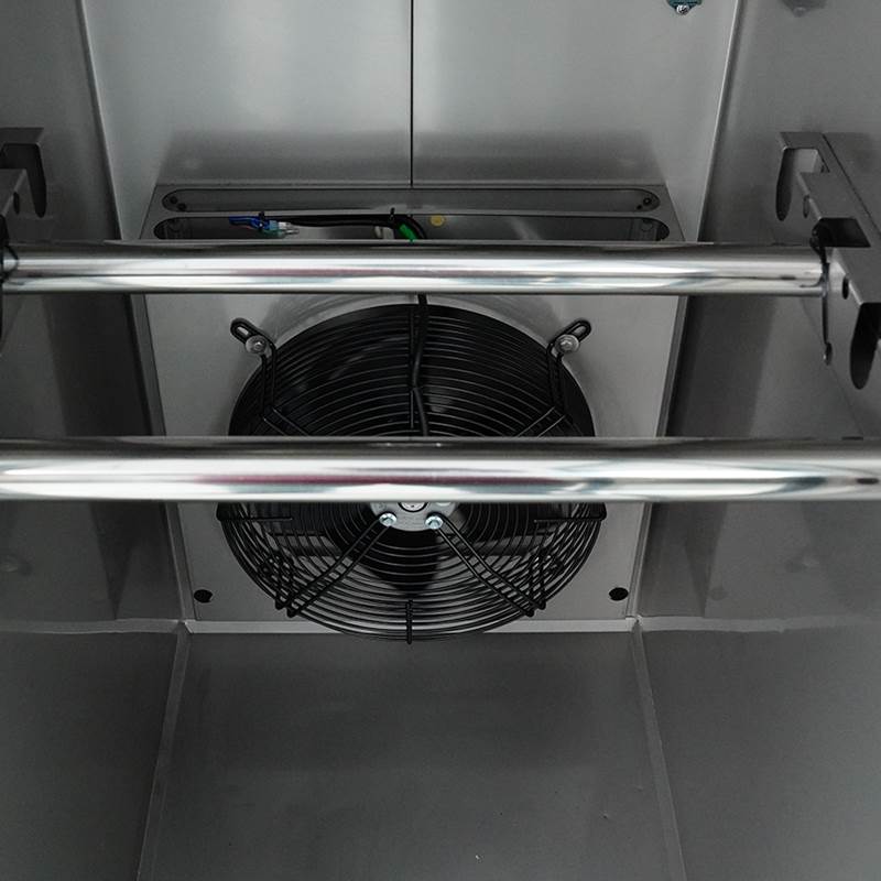 Bên trong tủ có 2 tầng giá treo chắc chắn, tạo không gian rộng rãi, thuận tiện cho việc sắp xếp và thao tác thực phẩm. Đặc biệt, hệ thống thanh treo có thể điều chỉnh linh hoạt, cho phép treo cùng lúc nhiều gà vịt trong một mẻ sấy, đáp ứng tốt nhu cầu chế biến của nhà hàng, quán ăn và cơ sở sản xuất quy mô vừa và nhỏ.